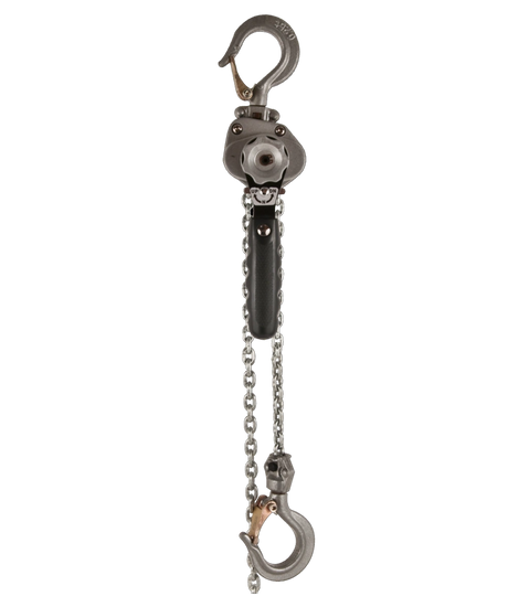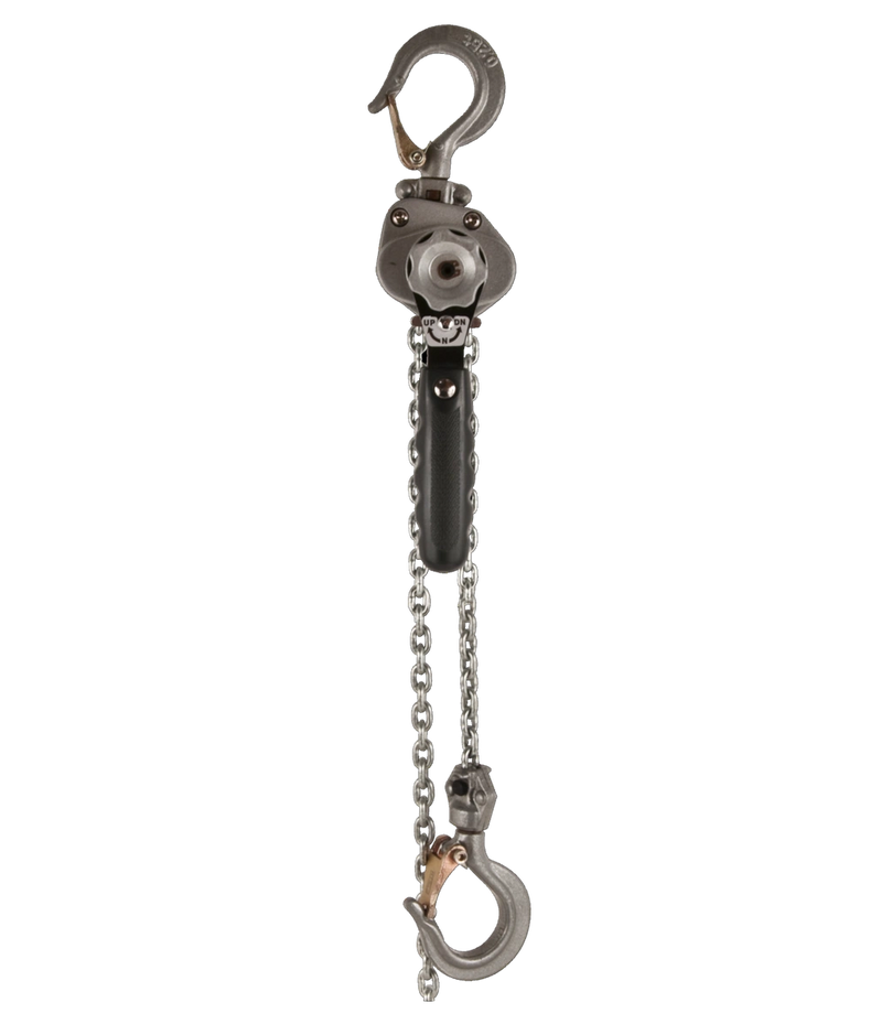 The JET® JLH Compact Lever Hoist integrates safety, durability and innovation enabling it to operate in the most demanding industrial environments. The lightweight design is achieved with a durable aluminum alloy housing that reduces weight for ease of transport. The dual pawl Weston style brake system splits the load to opposite sides of the ratchet gear for greater load security. Mechanical advantage is gained by the JET® exclusive addition of the five gear drive train requiring less force to lift or secure a load. Included is a nylon carrying case for convenient transportation, reducing trips to the tool room and prevents any unnecessary damage to the hoist. The JET® JLH Compact Lever Hoist is available in ¼ ton and ½ ton capacities with standard lifts of 5, 10 and 15 feet (custom lifts available). Whether it’s inverted, vertical, horizontal, or any other load angle, the JET® JLH Compact Lever Hoist is the solution for your heavy-duty industrial needs. Complies with OSHA Regulations, ANSI / ASME B30.21, and HST-3