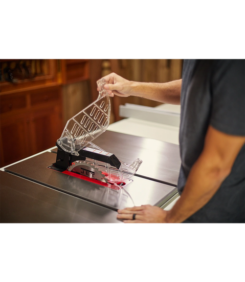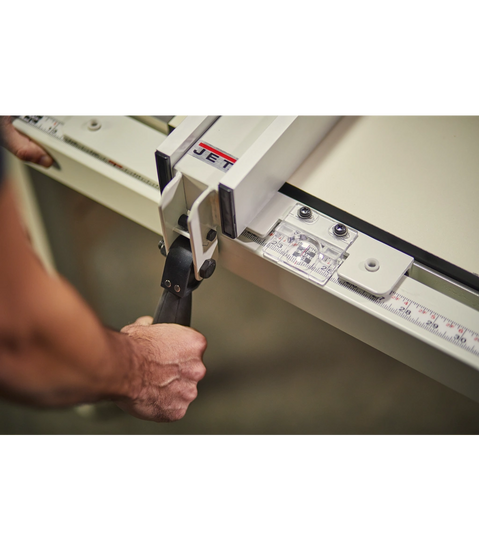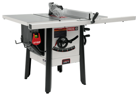The JET ProShop Table Saw offers features you expect from a high-end cabinet saw, in the compact design of a contractor-style machine. The redesigned transparent blade guard has independent leaves, and the quick release riving knife reduces chance of kickback. A low profile riving knife is included for non-through cuts. The exclusive ProShop fence system is available in 30” or 52” rip capacity.