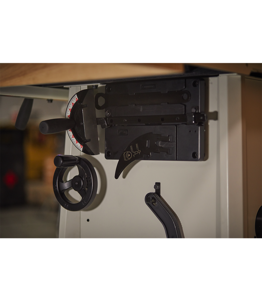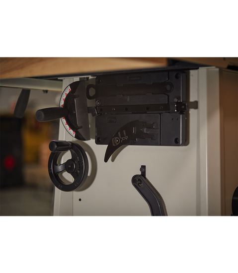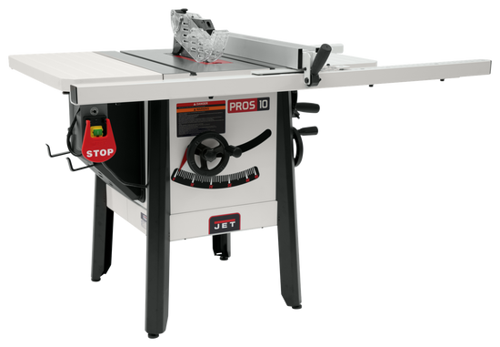 The JET ProShop Table Saw offers features you expect from a high-end cabinet saw, in the compact design of a contractor-style machine. The redesigned transparent blade guard has independent leaves, and the quick release riving knife reduces chance of kickback. A low profile riving knife is included for non-through cuts. The exclusive ProShop fence system is available in 30” or 52” rip capacity.