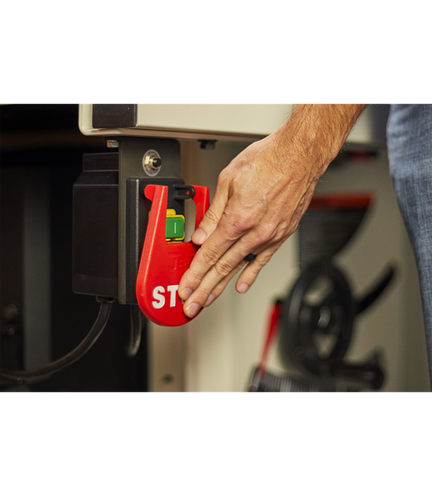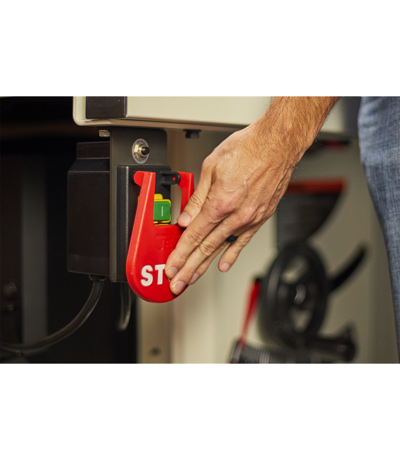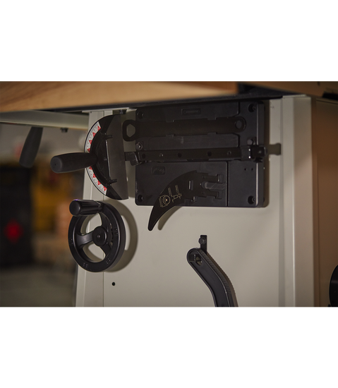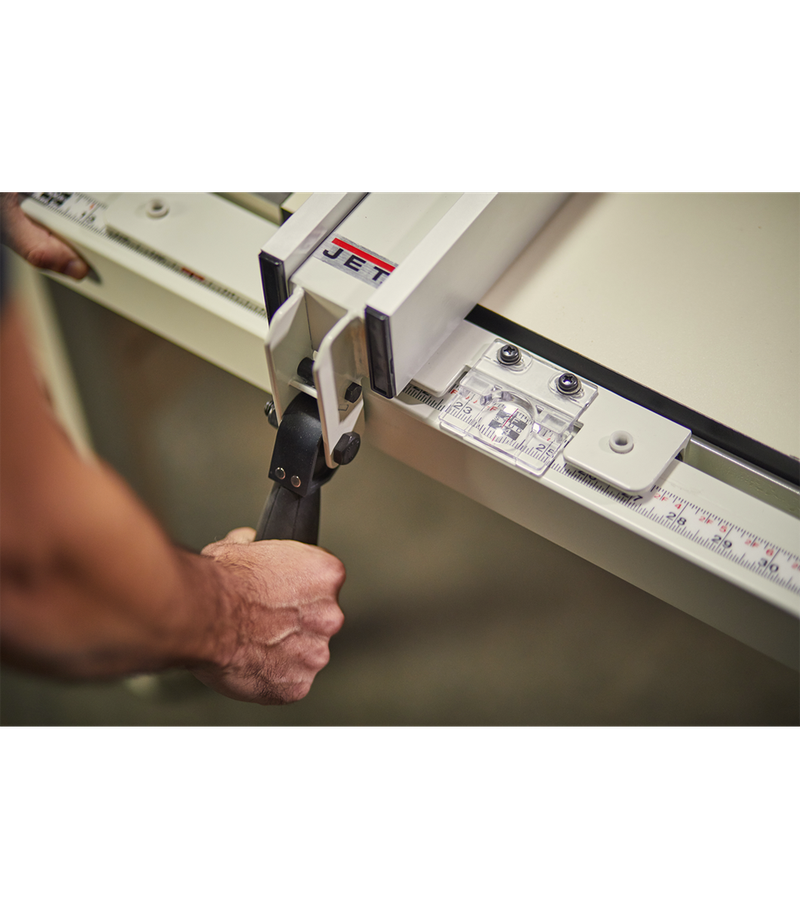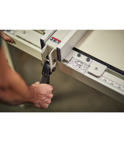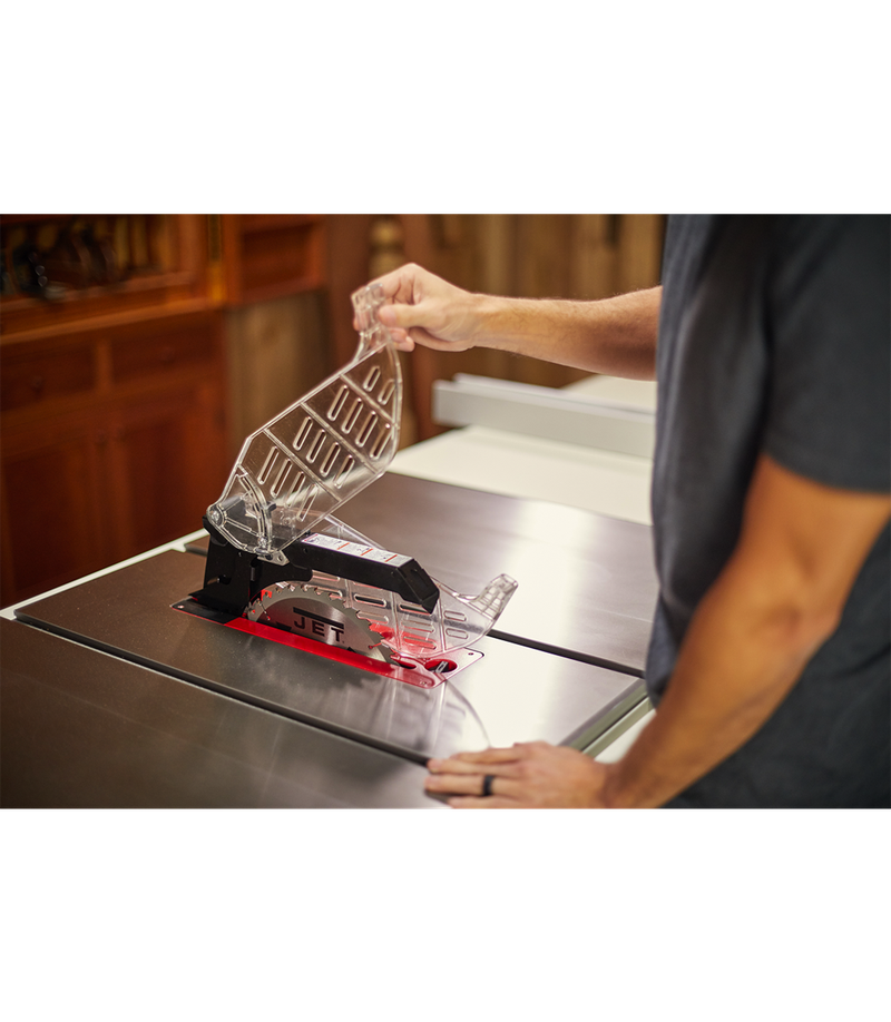 The JET ProShop Table Saw offers features you expect from a high-end cabinet saw, in the compact design of a contractor-style machine. The redesigned transparent blade guard has independent leaves, and the quick release riving knife reduces chance of kickback. A low profile riving knife is included for non-through cuts. The exclusive ProShop fence system is available in 30” or 52” rip capacity.